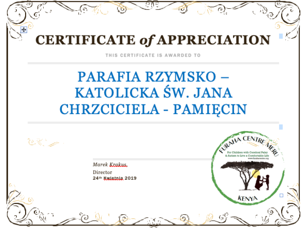 Chcielibyśmy podziękować księdzu Jarosławowi oraz Parafianiom z Pamięcina koło Kalisza za zbieranie w ramach jałmużny wielkopostnej datków na Furaha Centre w Kenii.