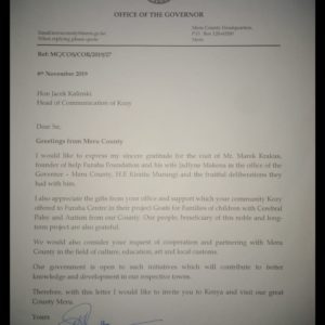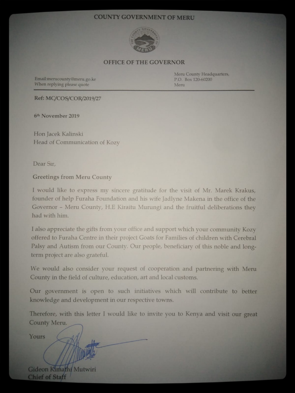 Home Wydarzenia i akcje specjalne List od Gubernartora Hrabstwa Meru już w Kozach