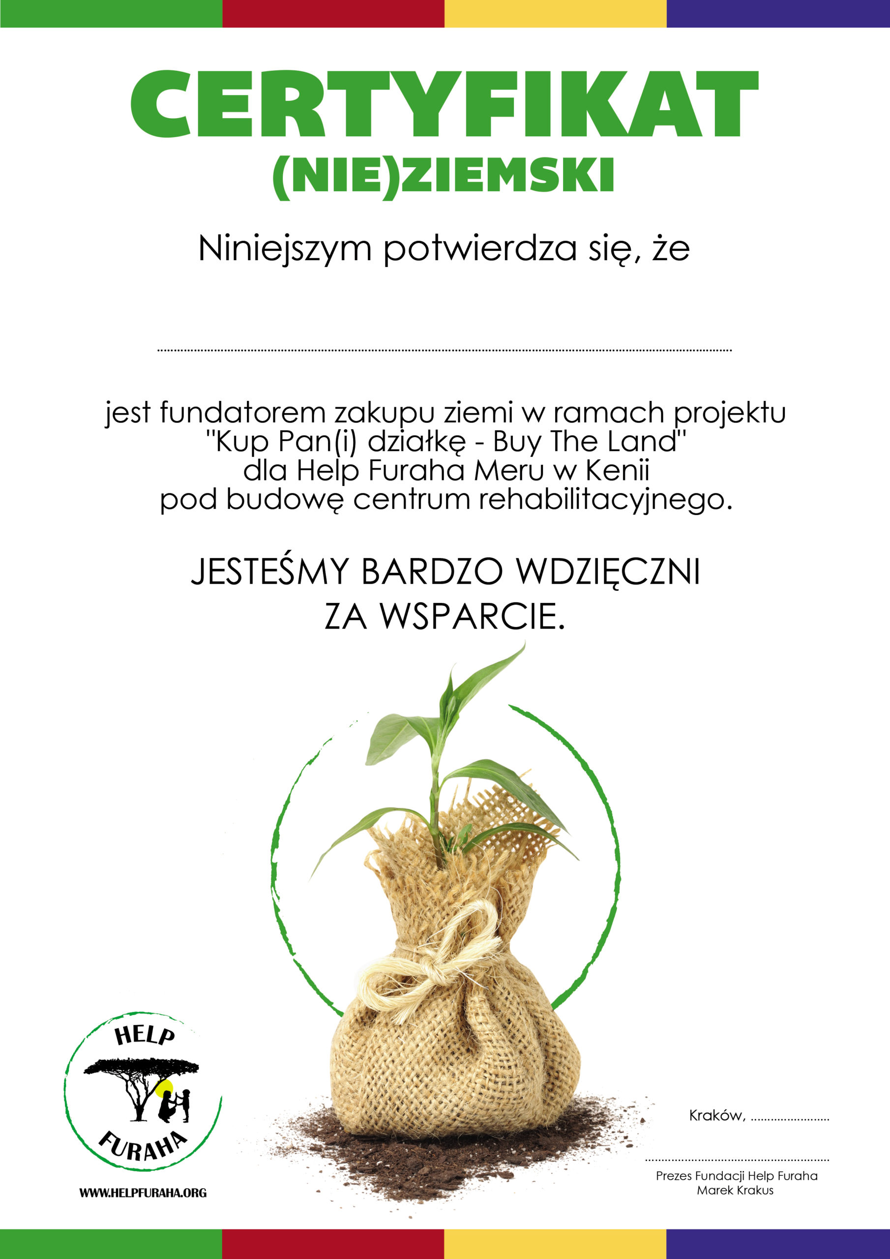 z autentyczną kenijską ziemią z działki, którą planujemy zakupić oraz (nie)ziemski certyfikat jako symbole