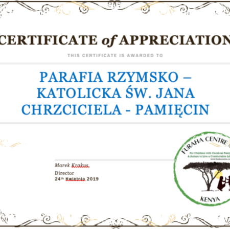 Chcielibyśmy podziękować księdzu Jarosławowi oraz Parafianiom z Pamięcina koło Kalisza za zbieranie w ramach jałmużny